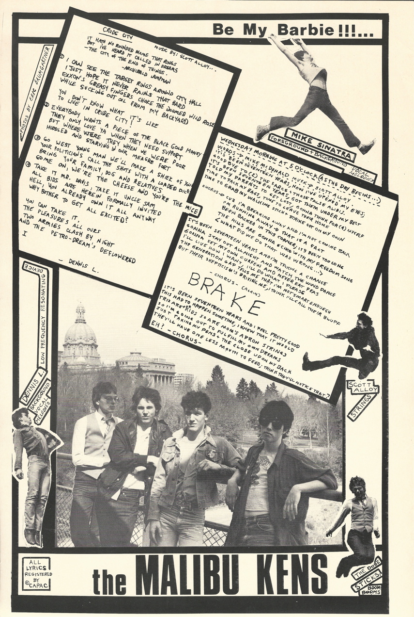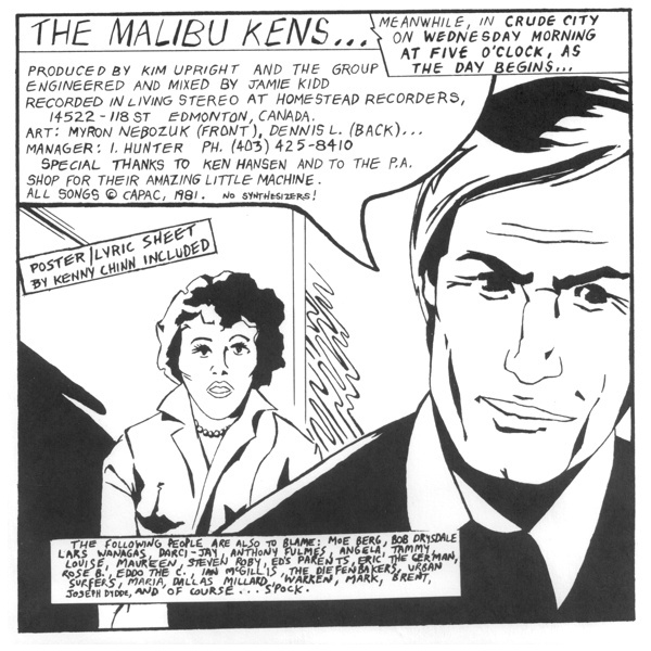 I don't recall who came up with the record title, but we chose something that stuck with the Malibu Ken theme. We had numerous resources available to us for the artwork: Dennis designed the record label and back cover, Myron Nebozuk drew the front cover art from a photograph taken of us from the Riviera Rock Room, Ken Chinn created the poster and lyric sheet, and Eric Baumgartner took the photos. 1000 copies of the record were produced (the minimum order at World Records).