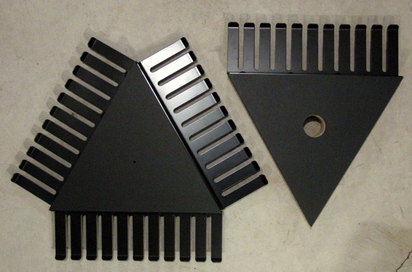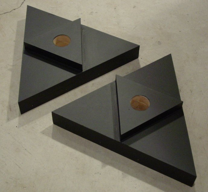 Several triangular pieces of wood (equilateral triangles 11 inches on each side) for the upper and lower tiers. I used three pieces of 0.75 inch thick MDF glued together and painted black. This was sufficient thickness to make a nice tight fit between the triangle and the speaker stand so that there's no wobble or tilt when all the cables are loaded. The lower tier has a hole cut through all three pieces of MDF (the clamp prevents it from sliding down). The hole in the upper tier does not go completely through all three pieces of MDF. Leave about 0.25 inches undrilled so that the upper tier can sit on top of the speaker stand.