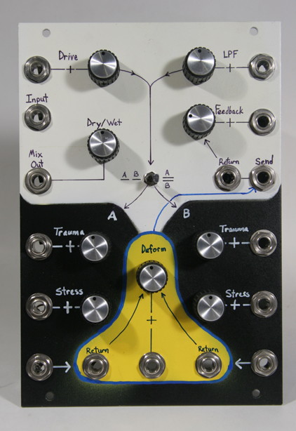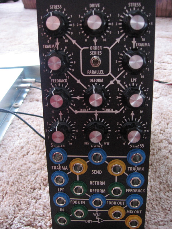 The TLN-156 features: an amplifier for controlling the input signal level, two reverb tanks that can be driven in series or parallel, separate recovery amplifiers and resonators for each reverb tank, a feedback amplifier with lowpass filter, and a deformation processor for combining the reverb tank outputs. Most parameters are voltage controllable and several patch points are available for adding additional signal processing. All inputs and outputs handle 10 Vpp audio signals and 5 volt control voltage signals (modular standard).