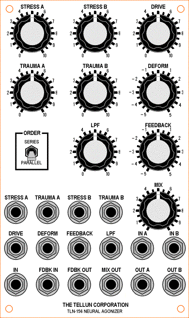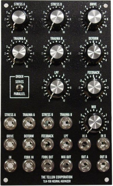 The TLN-156 Neural Agonizer is a voltage controlled spring reverb processor. Although this module can be used to simulate room reverb with most audio signals, it includes numerous enhancements specifically designed for interfacing to a modular synthesizer. If you're looking for a smooth, natural sounding reverb system to make your synthesizer sound like its being played in the Concertgebouw, then go buy a Lexicon. This is not your grandmother's reverb tank, this is a noxious tool capable of inflicting some serious damage to your audio.