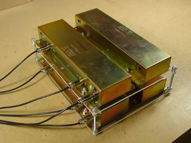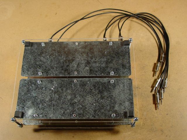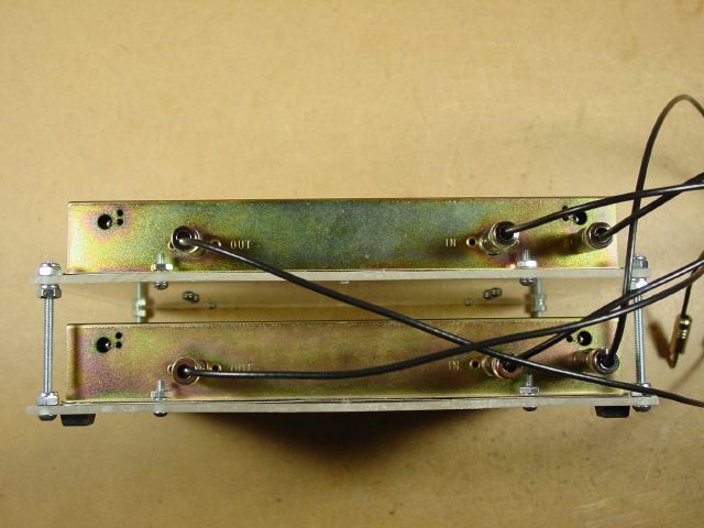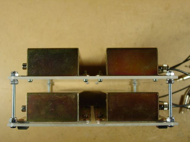 I built a structure out of two pieces of clear plexiglass for mounting four reverb tanks. I covered the bottoms of the reverb tanks with a small piece of sheet metal so that they would be fully shielded. I originally intended to place this structure inside one of my cabinets, right behind two TLN-156s with Stooge panels. But when everything was in place I was getting a terrible 60 Hz hum from one of the TLN-156s. The hum was being induced into the reverb tanks by a power supply in an adjacent cabinet. I was able to lessen the hum by moving the tanks further away from the offending power supply and rotating them 45 degrees. But I was unable to eliminate the hum entirely as long as the tanks were inside the cabinet because there was always a power supply within one foot of at least one of the reverb tanks. Here's the procedure I used to find a hum-free location for my reverb tanks.