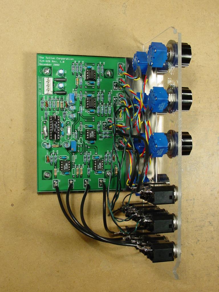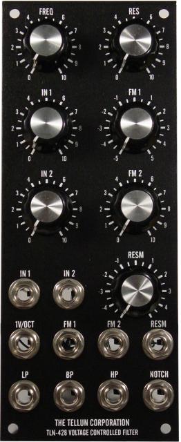 DescriptionThe TLN-428 is a state variable filter built around a Curtis Electromusic Specialties CEM 3320 chip. Four simultaneous outputs (all with two pole response) are provided: low pass, high pass, band pass, and notch. A built in mixer allows for two audio inputs. The filter frequency can be set using a panel mounted pot, a "one volt per octave" external control voltage, or via two external FM inputs with attenuators (one reversing). Filter resonance can be set using a panel mounted pot or an external control voltage with a reversing attenuator.