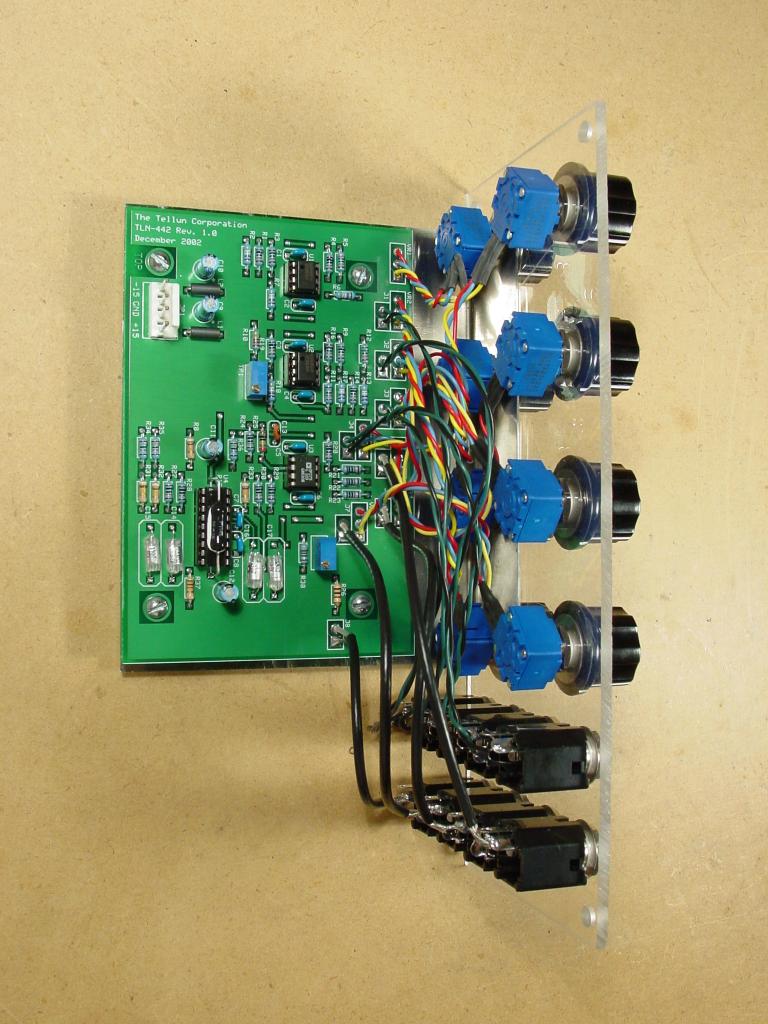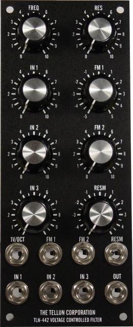 DescriptionThe TLN-442 is a four pole low pass filter built around a Curtis Electromusic Specialties CEM 3320 chip. A built in mixer allows for three audio inputs. The filter frequency can be set using a panel mounted pot, a "one volt per octave" external control voltage, or via two external FM inputs with attenuators (one reversing). Filter resonance can be set using a panel mounted pot or an external control voltage with a reversing attenuator.