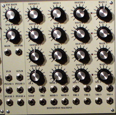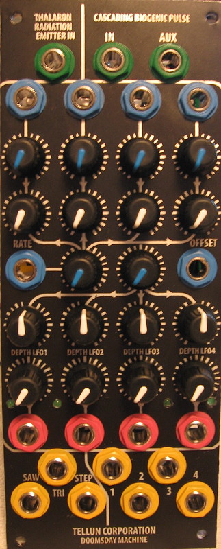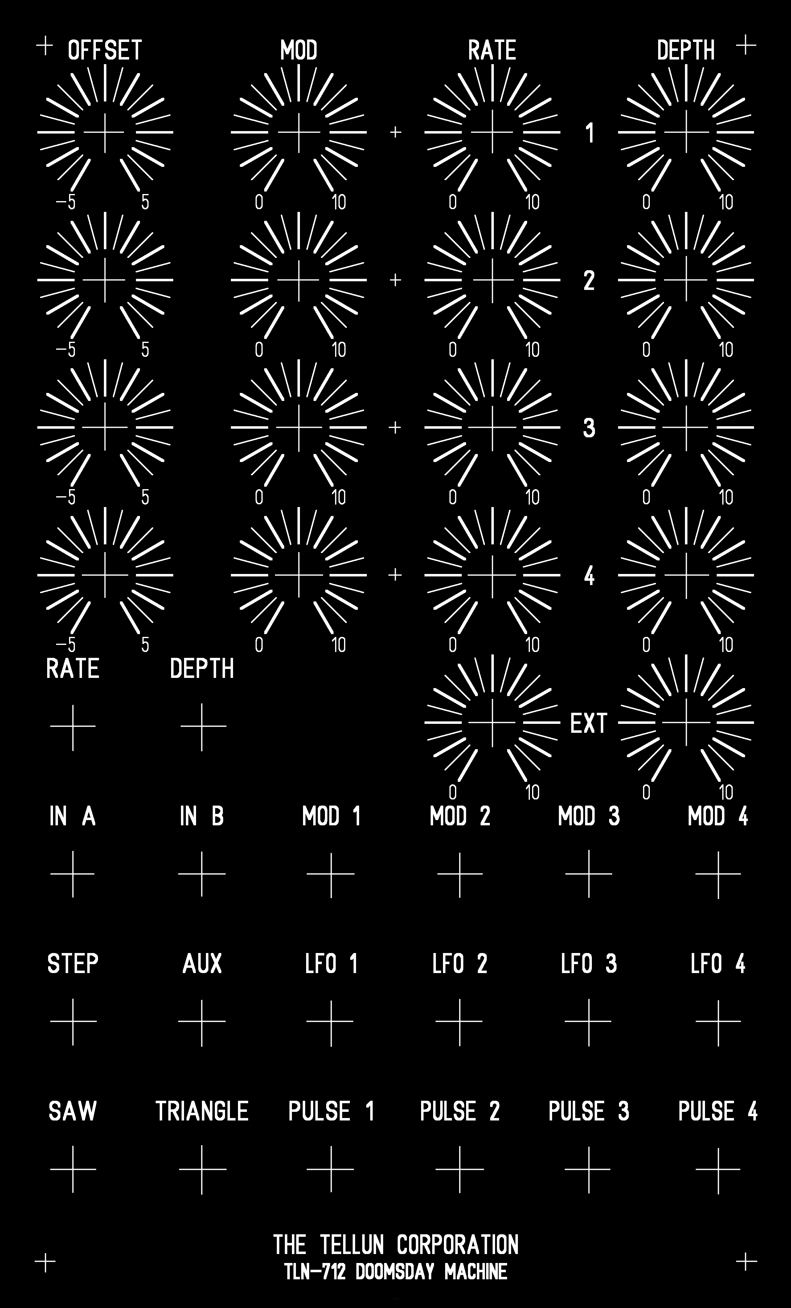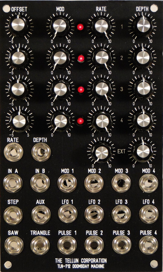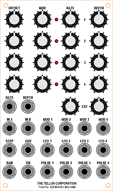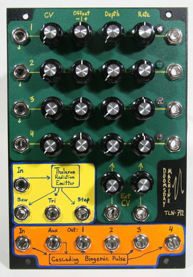 The TLN-712 Doomsday Machine is a voltage controlled waveform animator for modular synthesizers. Originally conceived as two separate modules, the TLN-712 comprises two different animation circuits and four voltage-controlled LFOs (low frequency oscillators). The first animator (Thalaran Radiation Emitter) is based on the Multi-Phase Waveform Animator by Bernie Hutchins. The second animator (Cascading Biogenic Pulse) is based on the Pulse Width Multiplier by Craig Anderton. Both animators have been combined into one module along with four LFOs to create a self contained system that makes optimal use of panel space. All you need to add is a single oscillator and a few patch cords to create a marvelous mayhem of sonic madness. Add a second oscillator and you'll never get a date to the prom.