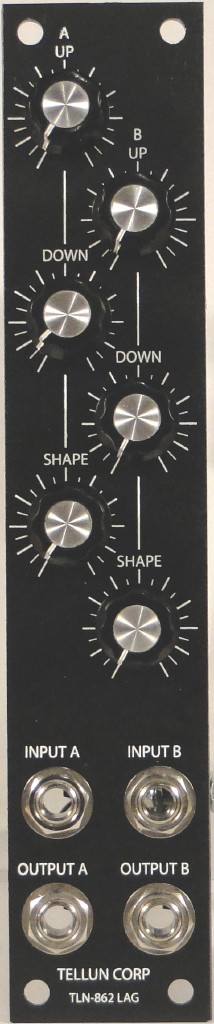 The TLN-862 Lag Processor is a MUUB implementation of Harry Bissell's Morph Lag circuit. The Morph Lag has independent controls for setting the rise and fall times, and a shape control to vary the response between linear and logarithmic. Lately I've found I am needing lots of lag processors to smoothen control voltages (particularly from crappy 8-bit MIDI to CV boxes). The MOTM-820 is a fabulous lag processor with voltage controlled everything (I have several) but it is overkill for some of my needs. The TLN-862 is a good way to get lots of lag processors in as small a space as possible.