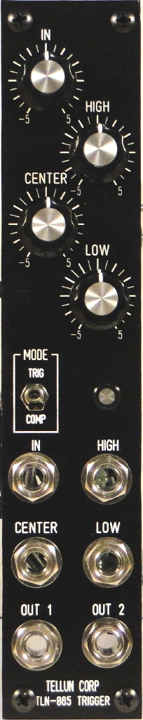 The TLN-865 uses a center point and both high and low offsets from the center point to define the Lower_Threshold and Upper_Threshold. These CENTER, HIGH, and LOW voltages can all be set manually using front panel controls, or via external control voltages. Reversing attenuators are used for the input signal as well as the center, low offset, and high offset signals.