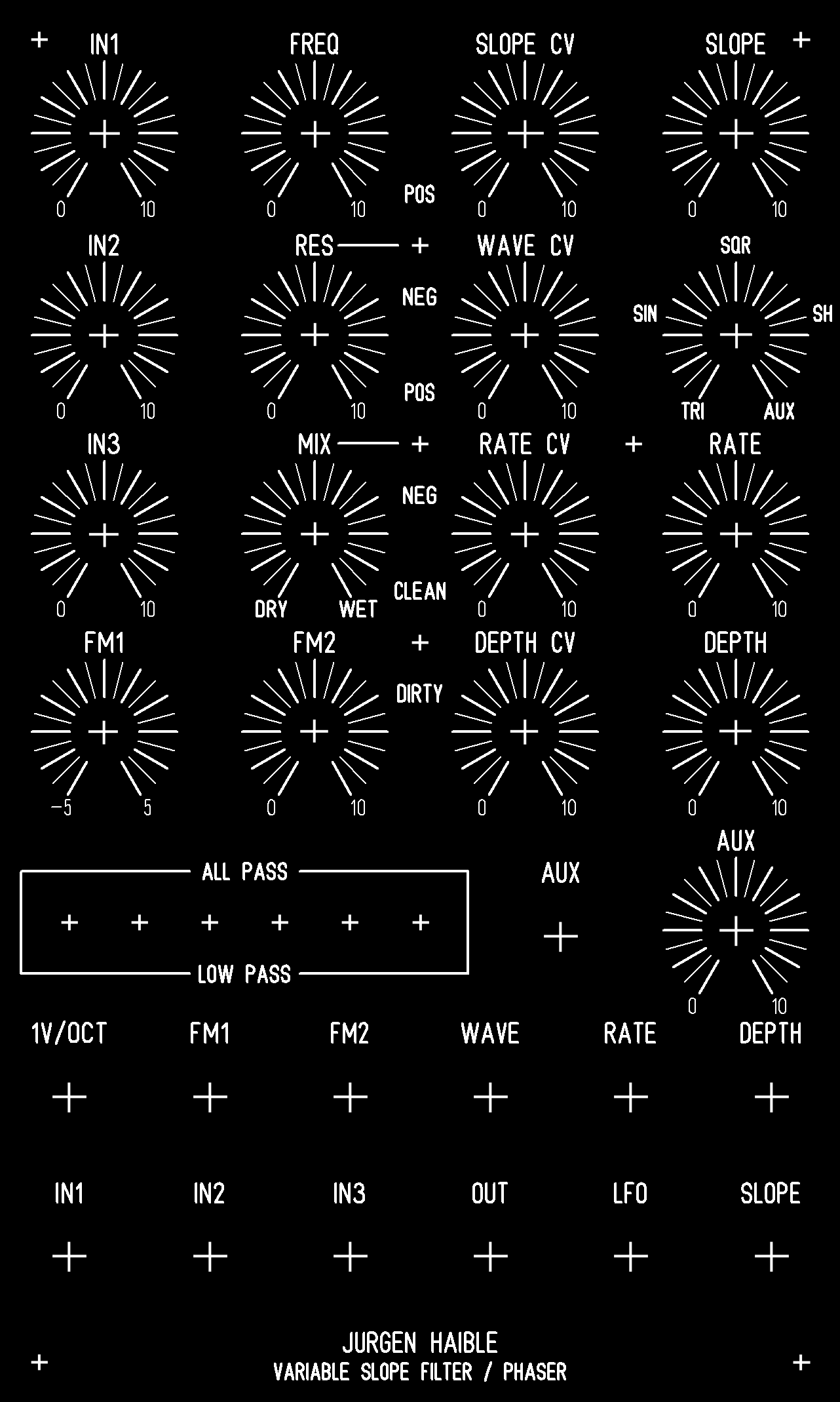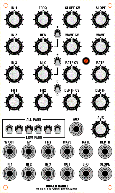 Apply a 30 Hz sawtooth wave to the IN1 jack and turn the IN1 pot 75% clockwise. Turn the MIX pot fully clockwise. Keep all other pots fully counter-clockwise. Set all filter switches to LOW PASS. Set the CLEAN/DIRTY switch to CLEAN. Listen to the signal at the OUT jack (and hook it up to an oscilloscope if you have one). Turn R84 until the signal at the OUT jack completely disappears. Turn the FREQ pot clockwise, you should start to hear something (or see something on the scope) once the FREQ pot is greater than 10% clockwise. Verify that turning the FREQ pot fully clockwise opens up the filter all the way and that you can't hear any of the upper harmonics being removed from the sawtooth.