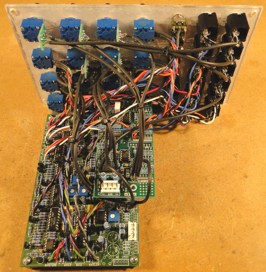 To set the 1V/OCT trimmer (R62) you'll need to have a voltage source that can output 1.00V to 4.00V in 1V increments and a reference oscillator. I used an MOTM-650 hooked up to a MIDI keyboard for the voltage source and a digital keyboard (outputing a sine wave) as the reference oscillator. Setup the voltage source and reference oscillator so that 1.00V corresponds to a frequency in the 100-150 Hz range and 4.00V corresponds to a frequency in the 800-1200 Hz range.
