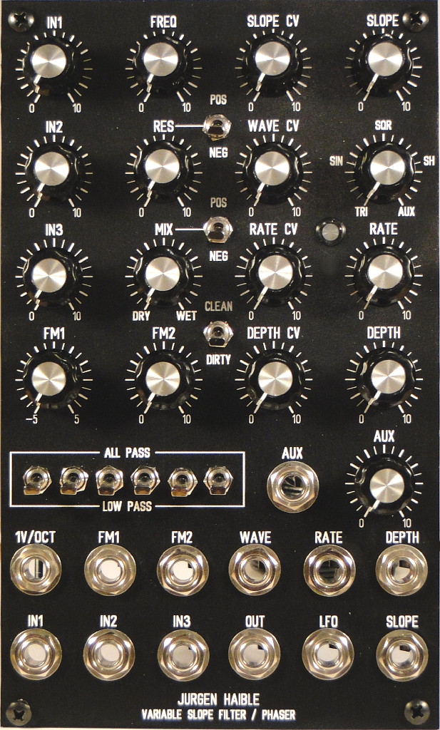 Connect the voltage source to the 1V/OCT input. Set all the filter switches to LOW PASS. Set the CLEAN/DIRTY switch to CLEAN. Set the RES switch to NEG. Set the MIX and RES pots fully clockwise. Set all other pots fully counter-clockwise. Listen to the filter output and turn the FREQ pot to make sure the filter can self-oscillate in the 100 - 1200 Hz range (or whatever range you are going to use with your reference oscillator).